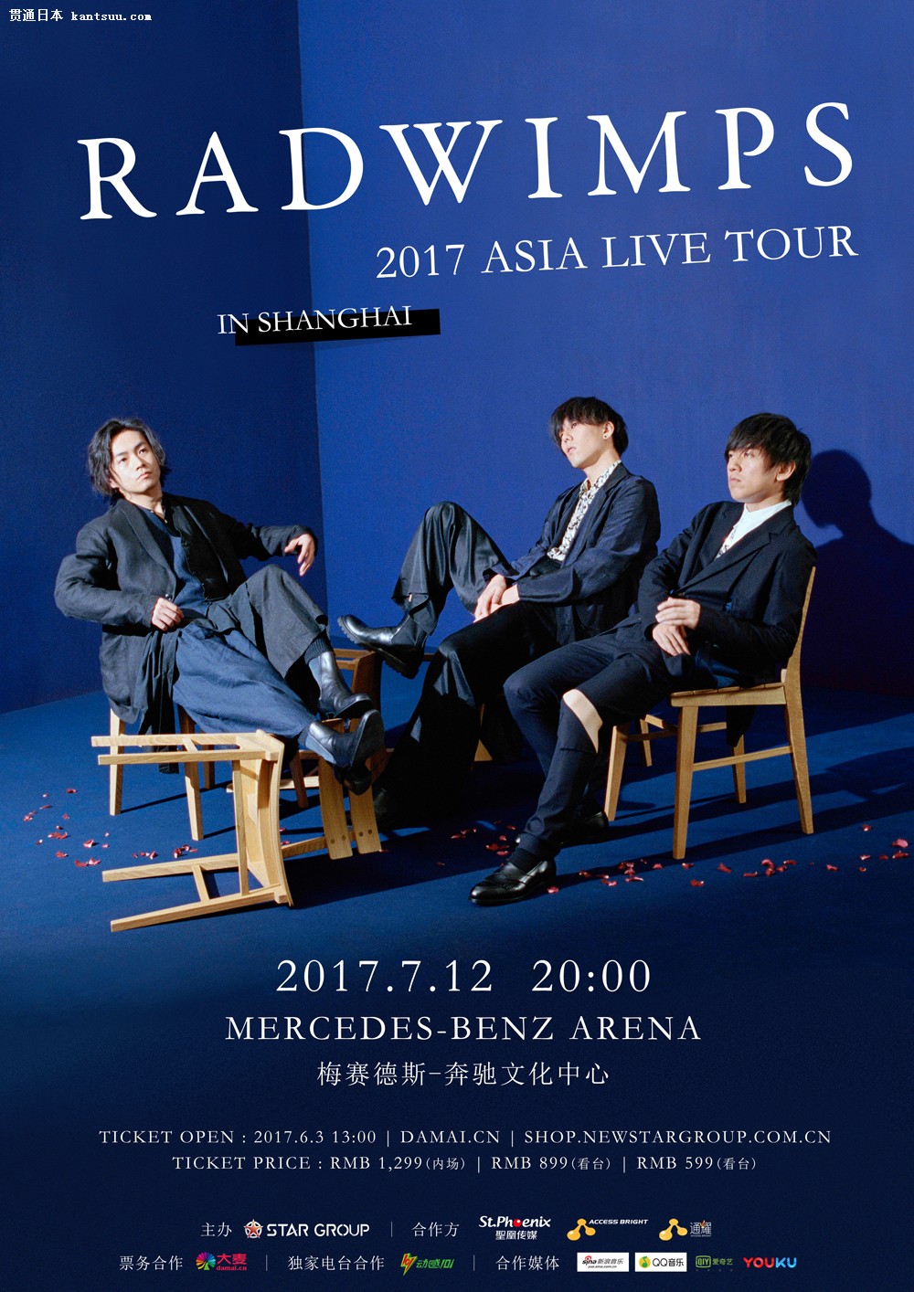 人气摇滚乐队RADWIMPS海报 网易娱乐5月26日报道 日本人气摇滚乐队RADWIMPS将于2017年7月12日在上海梅赛德斯奔驰文化中心举行“RADWIMPS 2017 Asia Live Tour in Shanghai”演唱会。此次演唱会是RADWIMPS在中国大陆的首场演出,届时将为各位歌迷带来跨越整个夏季最精彩的表演。 RADWIMPS成立于2001年,乐队同名专辑《RADWIMPS》于2003年问世。2008年,发表的《オーダーメイド》夺得ORICON单曲榜第一,同年5月,在MTV VIDEO MUSIC AWARDS JAPAN 2008,乐队获得BEST ROCK大奖。2010年,其作品《おしゃかしゃま》一举获得SPACE SHOWER录像带音乐大奖的BEST YOUR CHOICE大奖,成为SSTV举办MVA以来,连续两年获此殊荣的乐队。2011年发行的单曲《DADA》荣获ORICON每日榜TOP1。2013年,新专辑《Xと○と罪と》受到更多粉丝的关注与喜爱。 2016年,RADWIMPS为人气动画《你的名字》所创作的原声音乐将其音乐事业推向了新的高度,乐队不仅打造了包括《前前前世》在内的4首热门单曲,同时包办了22首配乐。原声大碟一经发售,便连续两周登顶ORICON公信榜专辑销售榜,乐队于年末首次登上了日本最高水准NHK红白歌会的舞台。 凭借着对音乐的无限热爱与执着追求,RADWIMPS在亚洲地区掀起了一阵摇滚热潮,在诸多好评与热议声中,目前,乐队正紧锣密鼓的筹备亚洲巡演,7月12日,在中国大陆的首场演唱会,必将留下令人深刻的印象! 本场演唱会将于6月3日下午13:00在主办单位上海星族文化艺术发展有限公司官网以及大麦网同步开售!欲知更多演出资讯,请留意主办单位官方微博(@STARGROUP-星族文化)。 演出信息: RADWIMPS 2017 Asia Live Tour in Shanghai 演出时间:2017年7月12日20:00 演出场馆:上海梅赛德斯奔驰文化中心 演出票价:内场1299元,看台899、599元 售票时间:2017年6月3日13:00 |